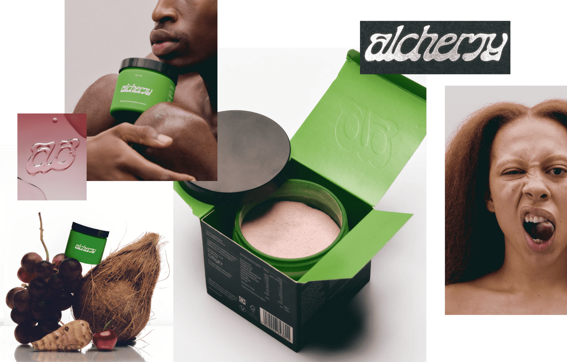 Alchemy anchors every product in a saturated, jade-green jar, then stages it against warm sunset gradients—think apricot to blush—to make the hero tone pop like a jewel. A fluid, free-form logotype weaves across the label, adding an almost liquid motion that mirrors the drink.