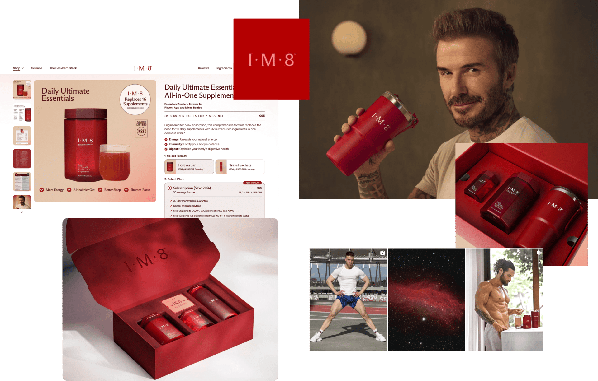 Orchidea strategic advice: For all-in-one supplement brands launching in competitive category with $150K+ brand development budgets, consider aggressive counter-positioning against category leader through visual language (IM8's red vs AG1's green), ingredient maximalism with clinical backing (92 ingredients, 12-week trial), and direct comparison marketing. Celebrity co-founder works only when paired with credible scientific partner (Beckham + Mayo Clinic doctors). Either alone creates skepticism. Together creates legitimacy. Bold differentiation (hexagonal jar, power-red color) ensures shelf distinction when placed next to established green competitors.