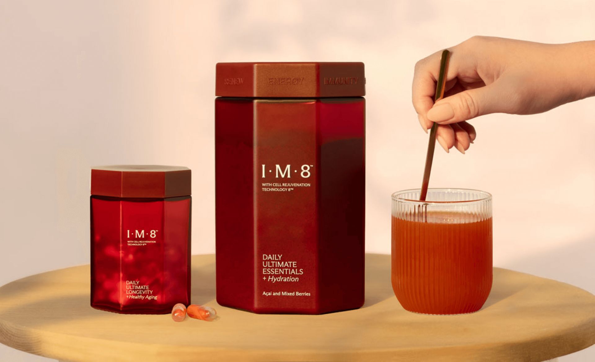 IM8 swaps wellness-industry greens for a punch-you-in-the-iris crimson: refill pouches, a matte shaker, even the metal scoop glint in power-red. Center stage is a custom hexagonal “forever jar” that stacks like a sci-fi fuel cell—angular, engineered, and impossible to mistake for anything on AG1’s soothing shelf.