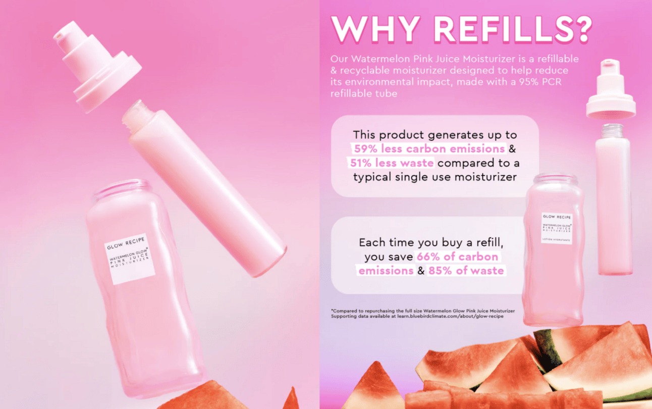 Glow Recipe integrates recyclable glass packaging into its products, offering an elevated aesthetic at affordable prices, usually $50 or less. Teaming up with TerraCycle, the brand introduced a no-waste recycling program. In 2021, they debuted their first refillable product, the Plum Plump Hyaluronic Cream. Customers can request a recycling envelope to easily collect and recycle their Glow Recipe products.