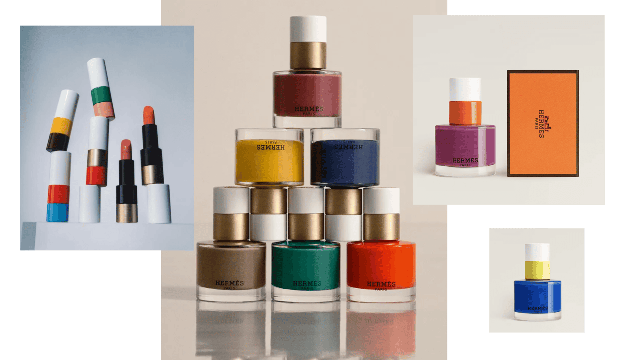 Hermès nail polish uses two-part cap with different colors. Creates modernist, artistic look. Like Piet Mondrian designed the packaging.