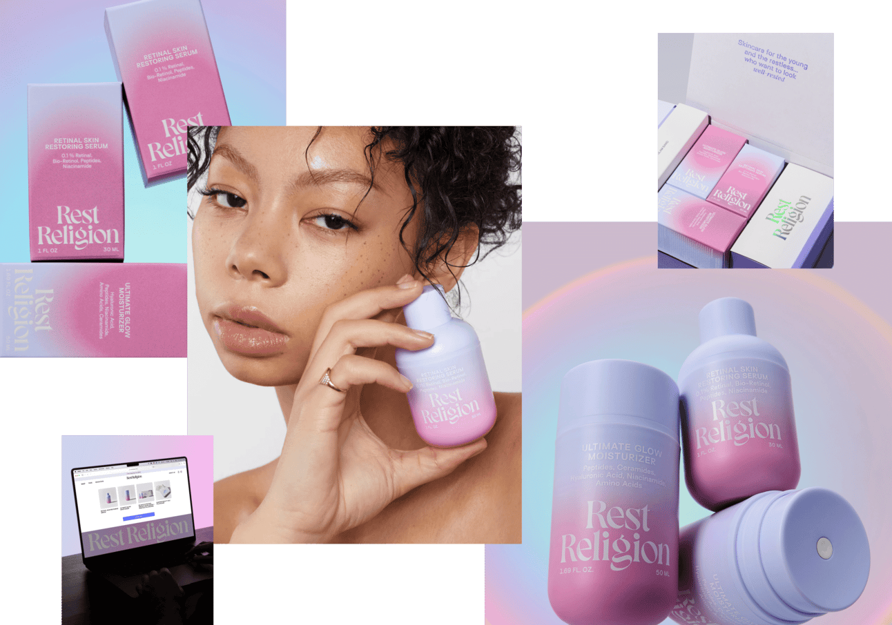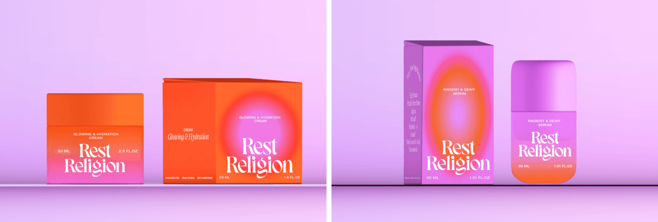 At Rest Religion, we built everything around the “Holy Halo” metaphor—a gradient that radiates from the product to your skin. The color palette is soothing and calming, with muted tones of purple and pink, creating a serene yet striking look that sets it apart from typical minimalist packaging.