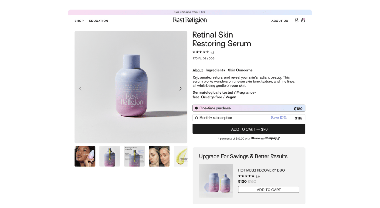 Hard data: Rest Religion featured in ELLE Magazine's best anti-aging serum roundup within months of launch. Strong day-one sales validated brand positioning. Investors praised work for delivering compelling story rooted in genuine consumer needs—something many brands fail to achieve. Brand's striking visual identity immediately resonated with customers, leading to conversion from first touchpoint.