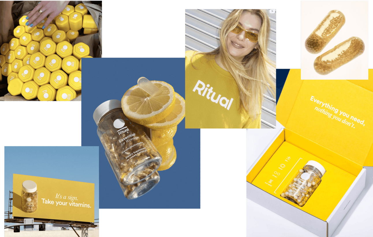 Ritual’s signature sunny yellow, it’s a psychological nudge. Yellow evokes clarity, hope, energy and the subtle promise of a more radiant, future-you! Paired with transparent capsules and rounded sans-serif fonts, the overall look feels clean, calm, and quietly confident. Monochrome minimalism pays off in the long run.