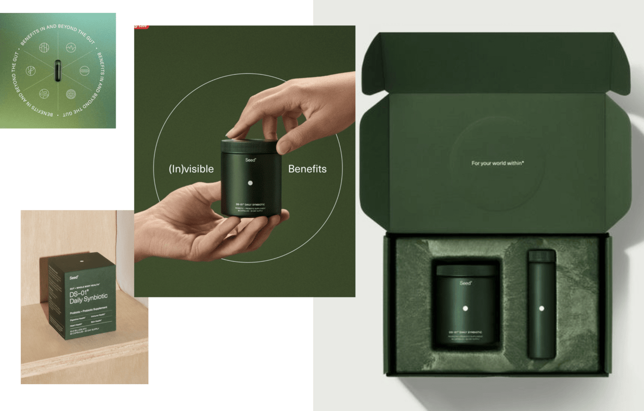 Seed's visual identity is precisely what you’d expect from a brand that cares about microbiomes: clean, structured, and intentionally minimal. Their iconic green refillable capsule is instantly recognizable — and environmentally designed. Typography is restrained. Layouts are tight. And nothing screams for attention — because when everything is considered, you don’t have to yell.