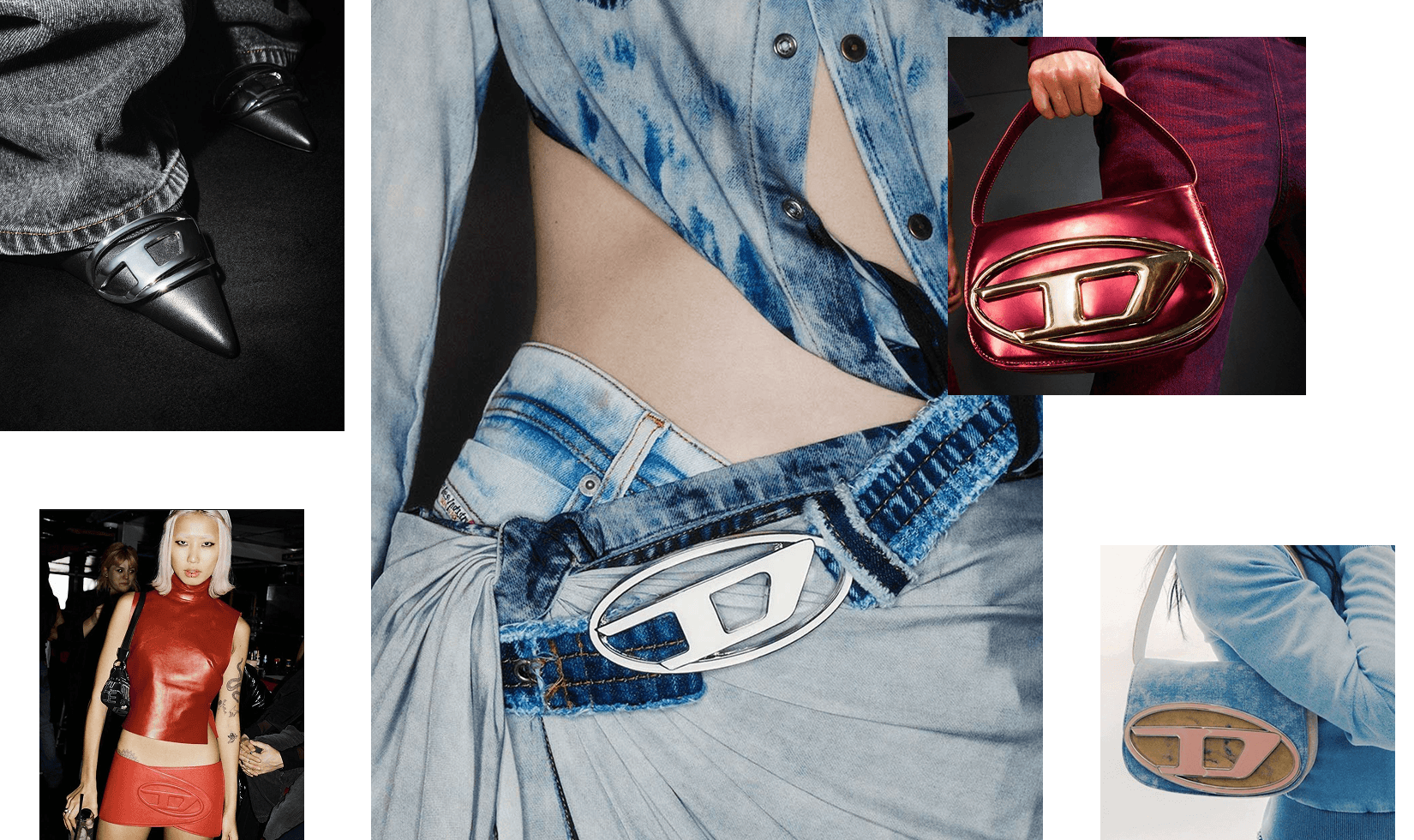Diesel’s recent evolution shows another dimension of symbolic power. Under Glenn Martens, Diesel didn't just update its identity. It amplified it. The Oval D became a central visual asset, but what made it powerful wasn't the design alone. It was how aggressively it was used. Oversized placements. Metallic hardware. Cut-outs. Embellishments. Rhinestones. The symbol wasn’t printed but constructed into the garment. And they weren’t afraid to make it huge, to make it feel sexy.